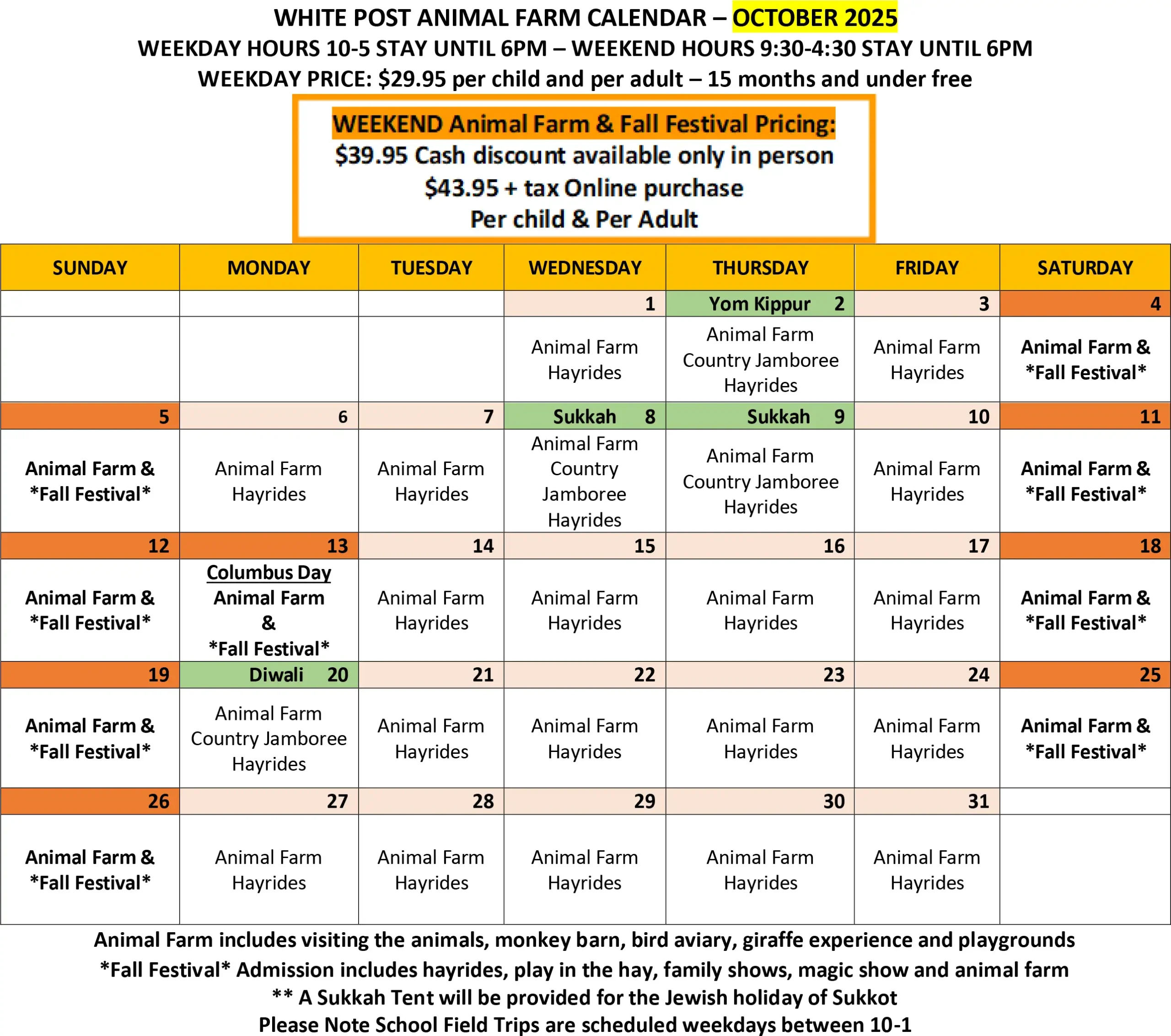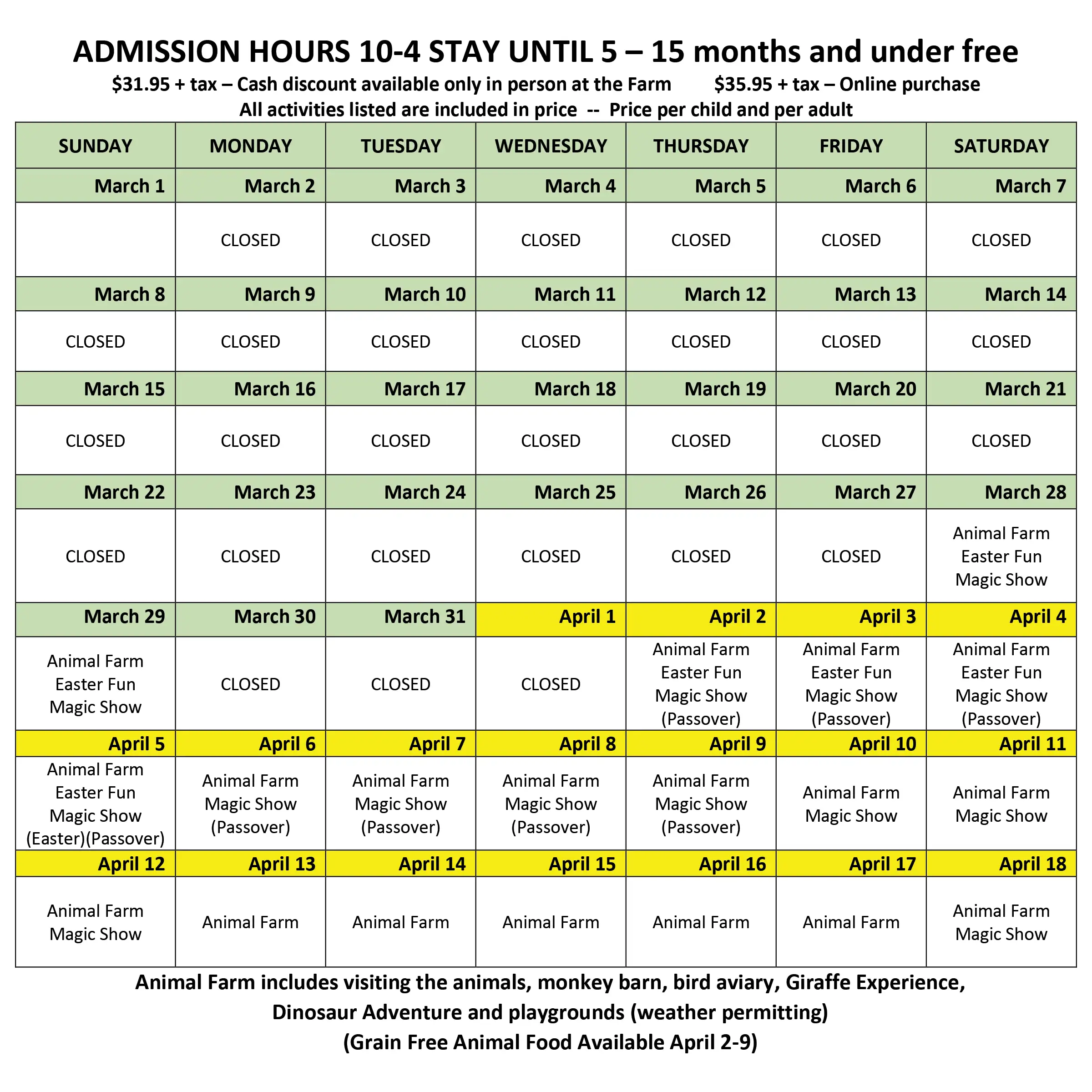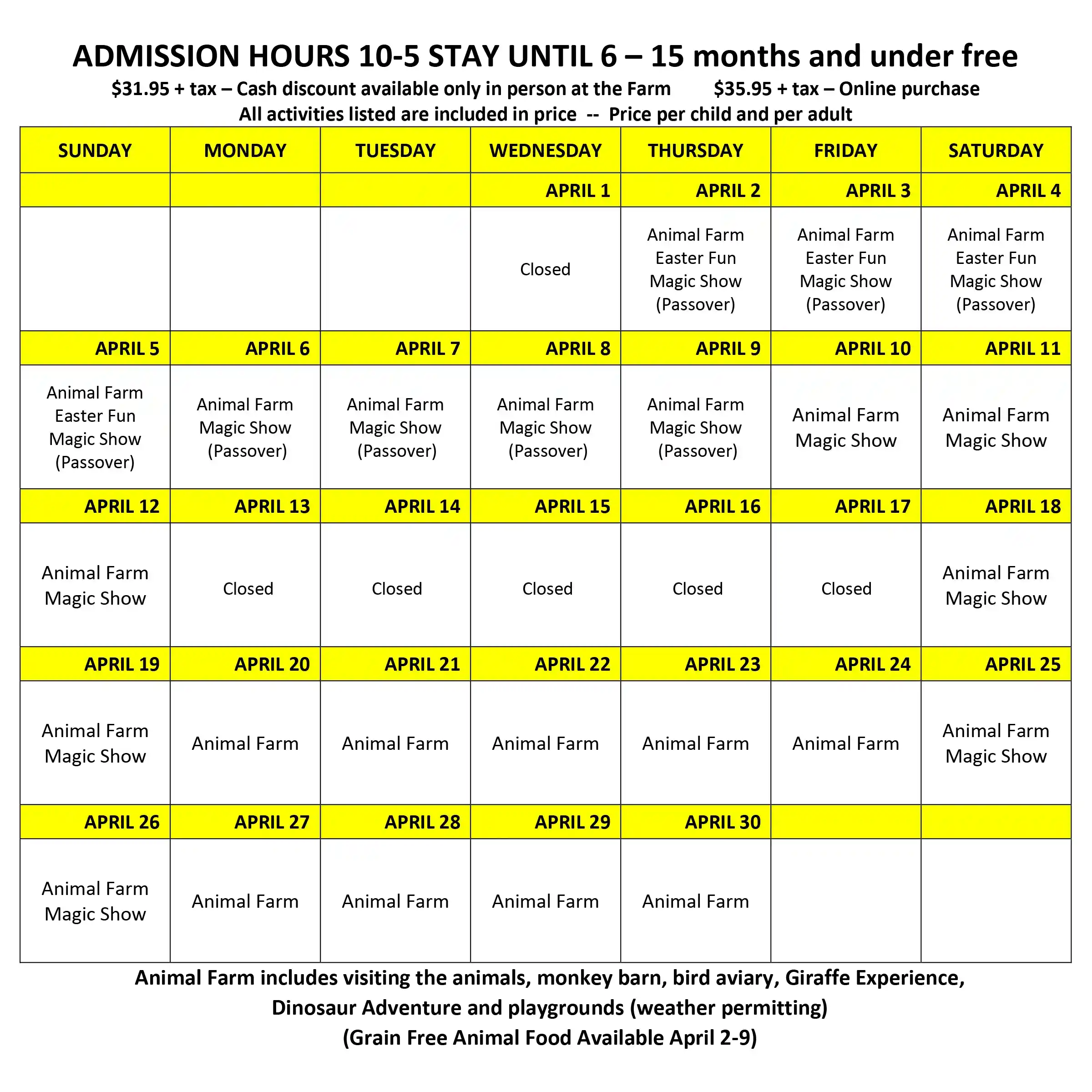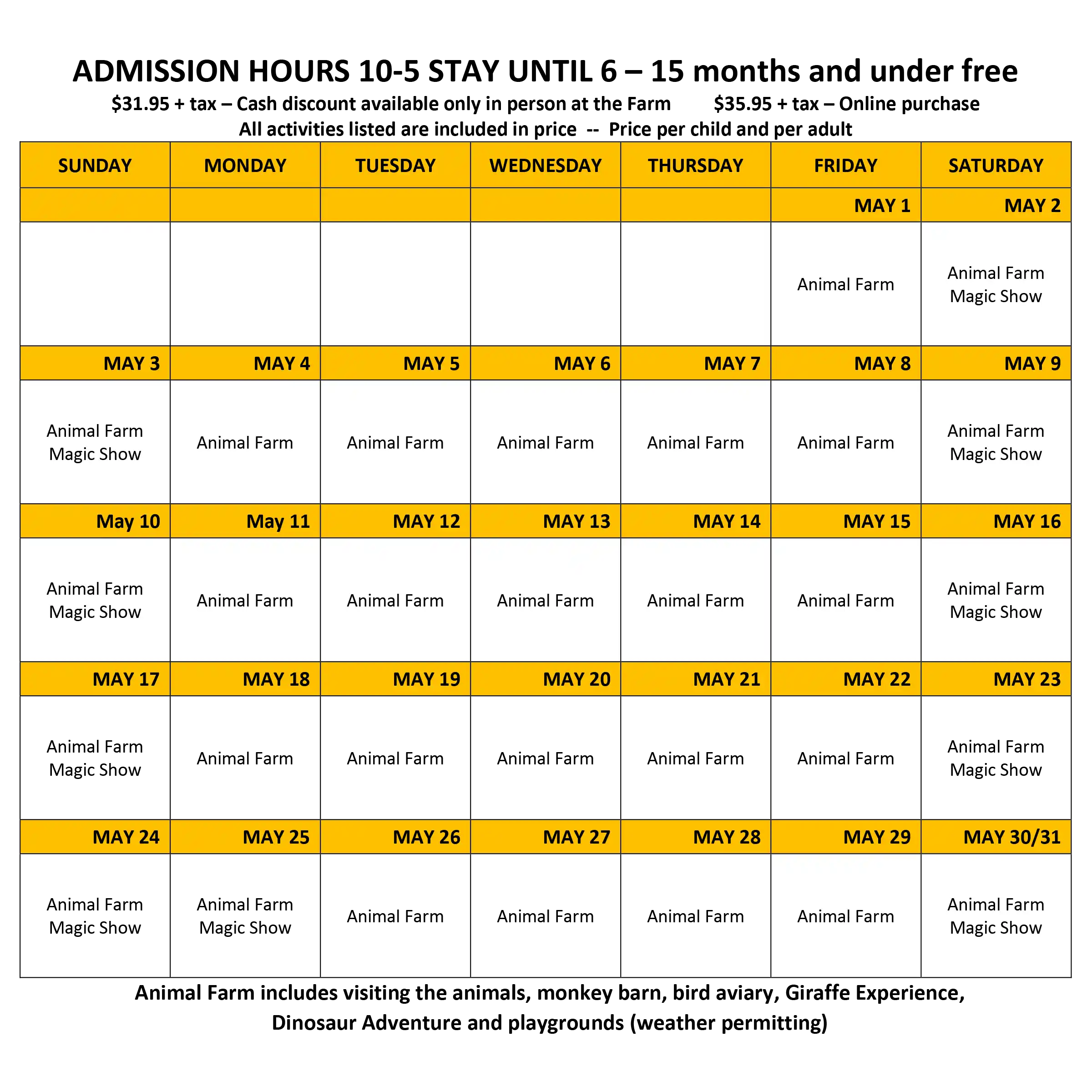 Animal Farm includes visiting the animals, monkey barn, bird aviary, giraffe experience, & playgrounds.